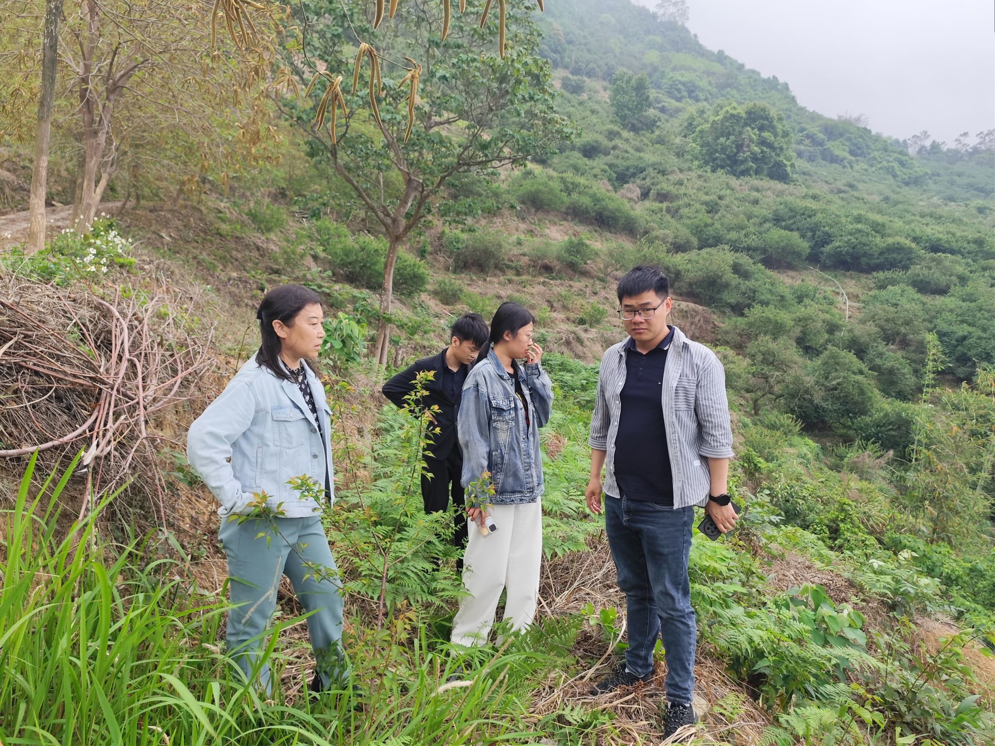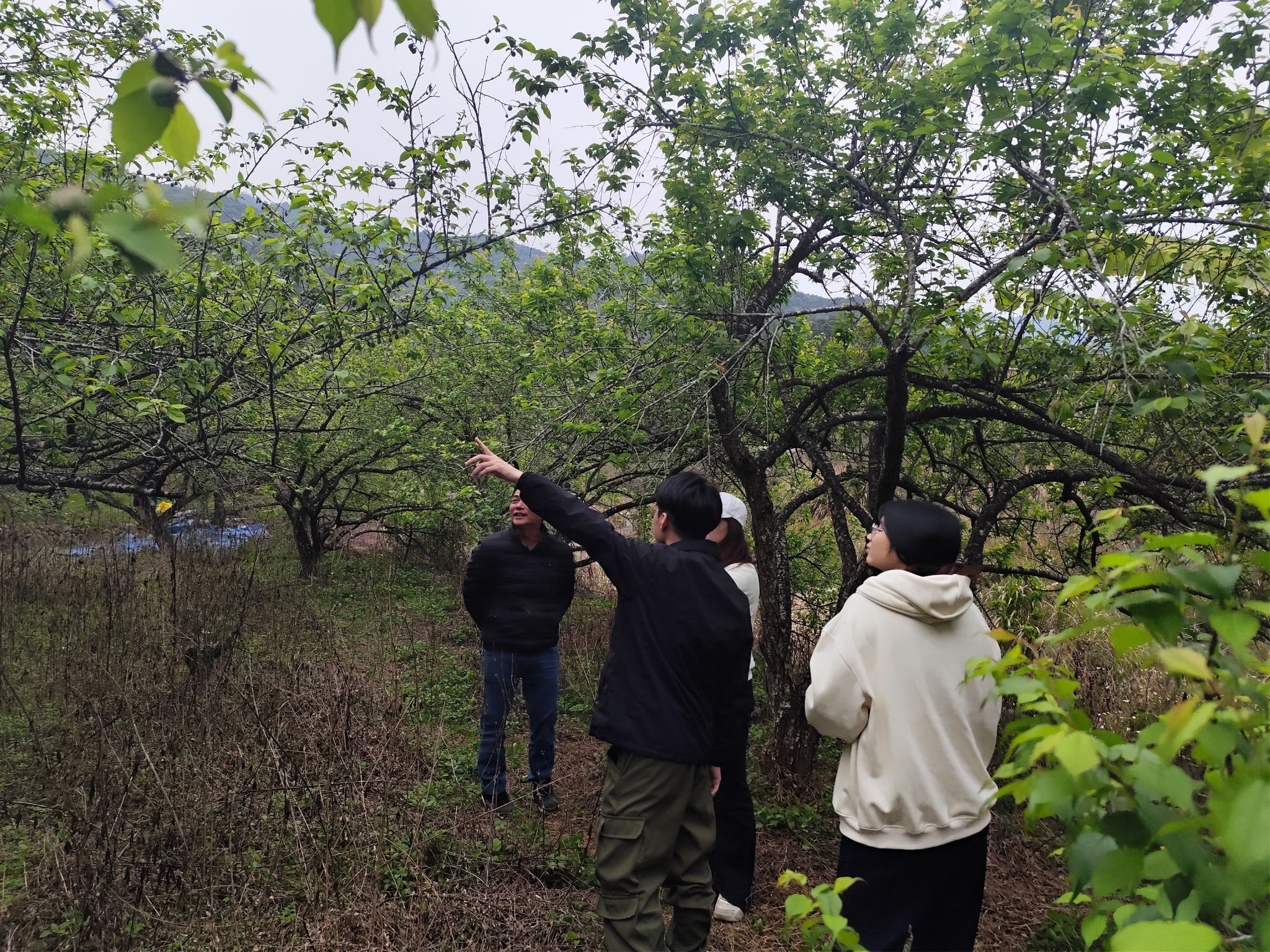 当日下午,高教授团队来到了科技小院的示范基地紫梅山庄,查看今年青梅果实的生长情况。今年是青梅结果的大年,花期气温适宜使得坐果率很高,树上果实累累,但也因为结果太多导致果实个头整体偏小。随后高教授又查看了去年引入诏安的梅新品种的生长情况。本次引入的‘南农丰娇’是高教授团队自主培育的花果兼用梅新品种,开花时花瓣呈粉红色,具有较高的观赏价值,同时果实大、产量高、品质好,如果推广开来,可以丰富当地品种市场,提高种植户效益。