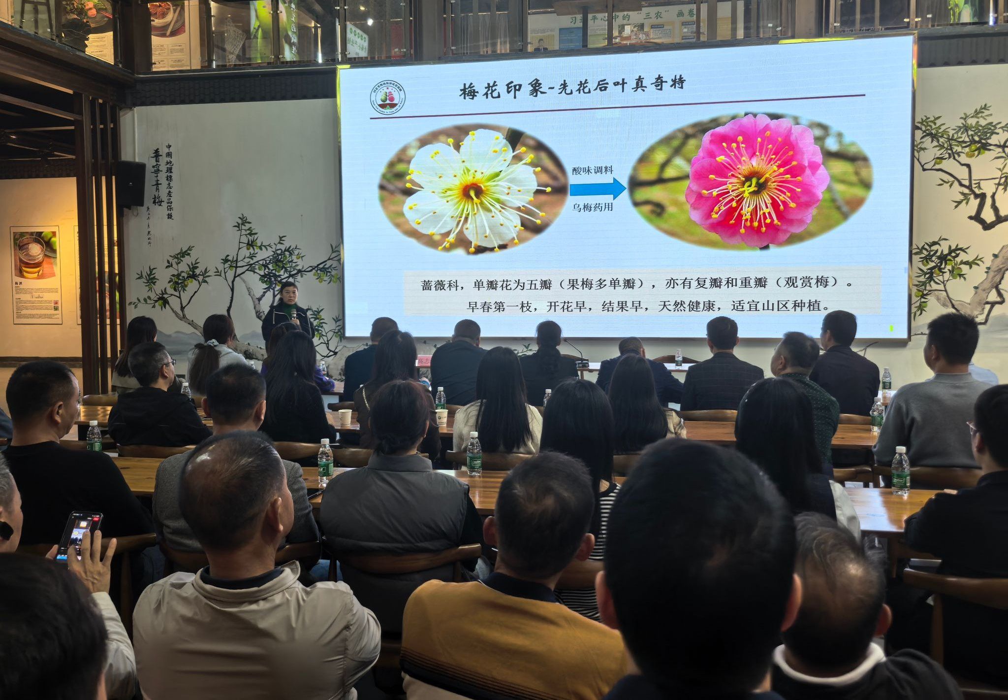 培训会上,高志红教授以 “普宁青梅三产融合可持续发展” 为核心主题,从多个维度展开系统讲解。她首先从 “梅的印象” 切入,通过生动的案例与详实的资料,带领大家重温青梅在文化传承、饮食文化中的独特地位,随后深入剖析了青梅的营养价值与药用价值。在品种溯源与创新部分,高志红教授详细介绍了广东梅的历史渊源与原产地独特的生态优势,同时重点介绍了南京农业大学青梅创新团队多年培育的优质新品种,为普宁青梅品种改良与结构优化提供了有力支撑。针对普宁青梅产业当前存在的品种单一化、产业链条短、附加值低、标准化生产水平不高等痛点,高志红教授提出了针对性的应对策略,强调要以三产融合为核心,推动青梅种植与加工、旅游、文化创意等产业深度融合,延伸产业链、提升价值链。